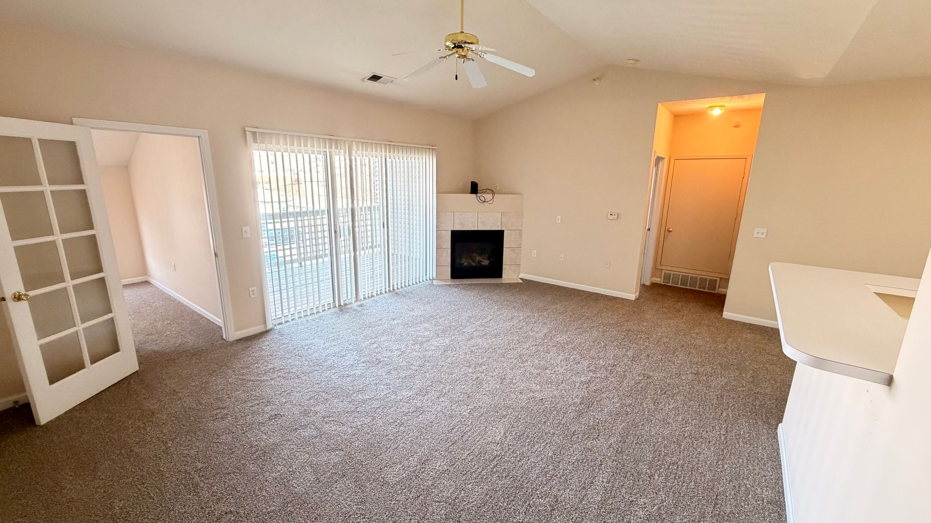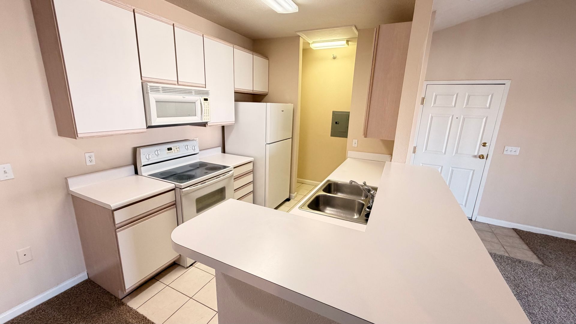 Very nice third floor apartment with vaulted ceilings and a cozy gas fireplace. Full whirlpool kitchen, including electric oven/stove/range, double stainless steel sinks with garbage disposal, refrigerator with ice maker, dishwasher and microwave.